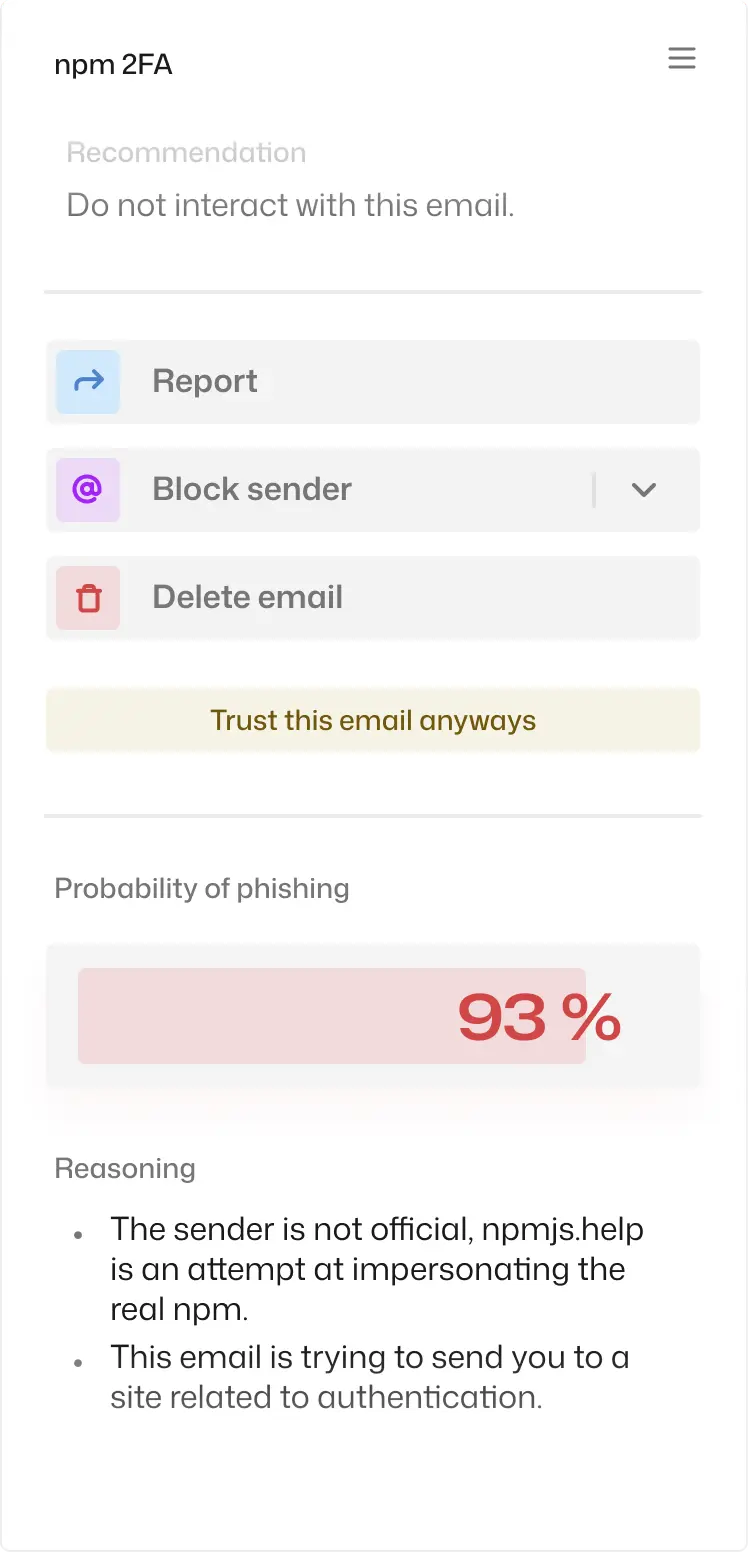 We have developed a true Zero-Trust Architecture. Unlike competitors' current email security solutions, your emails never leave your computer. Period. Our thorough analysis is exclusively done locally on each user's device. Experience the power of AI-driven security with absolute data integrity and complete privacy.